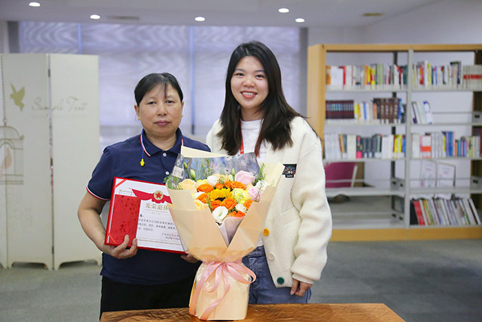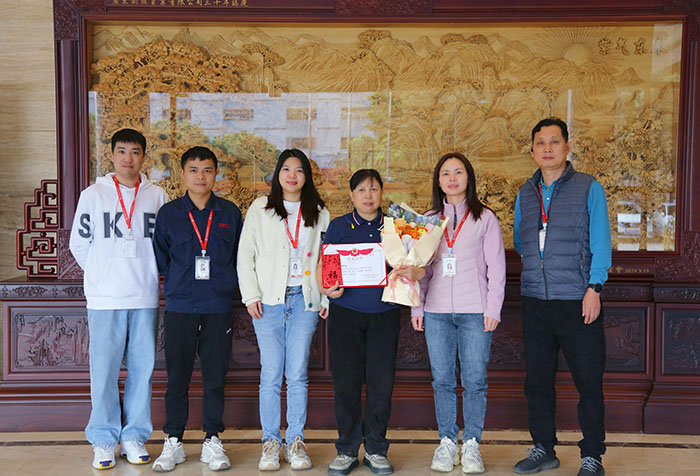 仪式现场,公司工委会主席郭斯镅、副主席周正华代表公司及全体同仁,向郑女士致以最诚挚的感谢与最美好的祝福。郭主席为她颁发了“光荣退休证书”与退休慰问金,这份荣誉与嘉奖,既是对她多年来在制造部岗位上兢兢业业的高度认可,也承载着公司对她的深切敬意;周副主席为她送上一束馨香雅致的鲜花,并衷心祝愿,她在未来的日子里能够保持健康、快乐,享受美好的退休生活。
