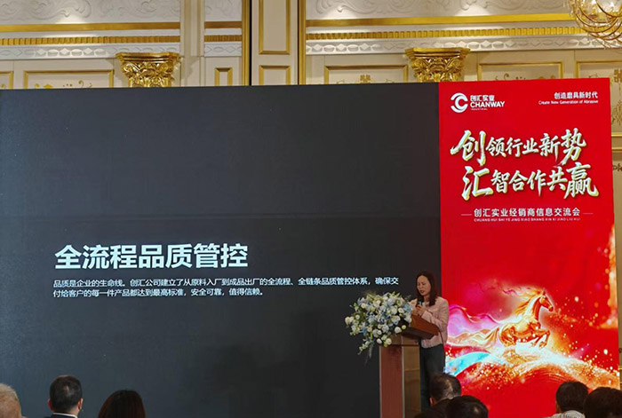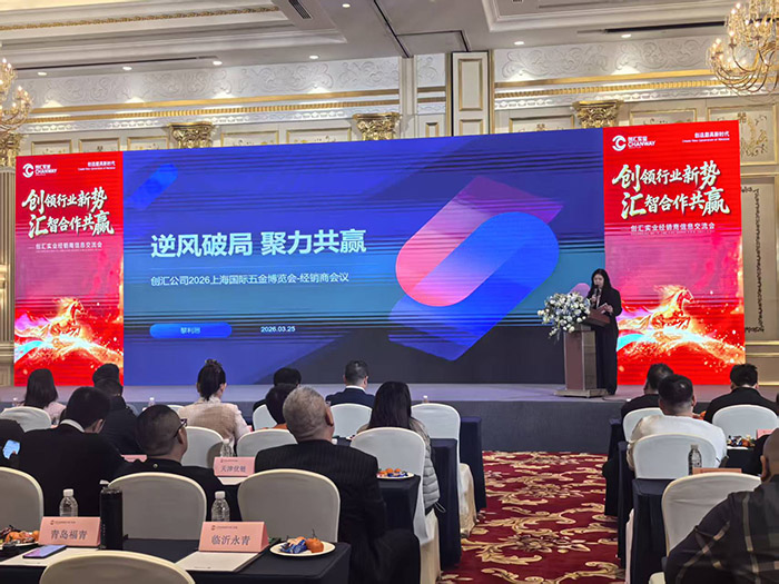除展会的精彩展示外,创汇实业还隆重举办 “创领行业新势・汇智合作共赢”经销商信息交流会,与全国经销商伙伴欢聚一堂,共叙情谊、深化协作,分享市场动态、技术成果与战略规划,共绘2026年及未来发展蓝图。公司常务副总经理杨沛杰、国内营销部经理黎利思、技术研发部经理周正华与全国各地经销商出席本次会议。